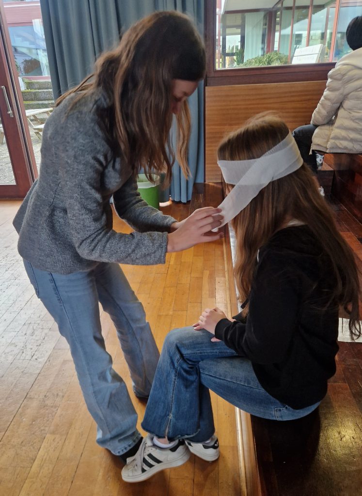 Ein weiterer Schwerpunkt des Besuchs war das Anlegen von Verbänden. Den Schülerinnen und Schülern wurden verschiedene Verbandsarten gezeigt. Danach durften sie selbst aktiv werden: Mit viel Freude banden sie sich gegenseitig die Köpfe und Hände.