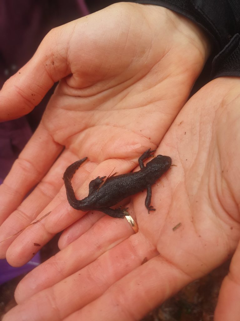 Wer den Blick einmal bewusst auf den Waldboden richtet, entdeckt Erstaunliches. Zwischen Laub und Ästen fand die Klasse tatsächlich einen Bergmolch – ein besonderer Fund, der für große Begeisterung sorgte.